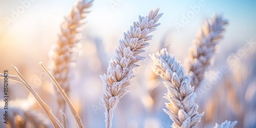Fototapeta premium Frost covered wheat stalks glisten in the morning light, showcasing the...