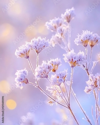 © BerkahStock, Naklejka premium Frost-covered wildflowers in soft light.