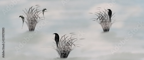 © venis, Obraz premium frost on grass silhouette bird on grass illustrations .Black and white Black bird On a branch art abstract Summer background