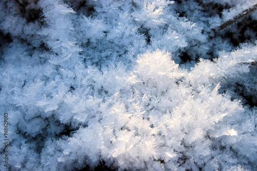 Fototapeta premium Frost on the leaves of the grass. The magic of the beginning of winter (frosted nature)