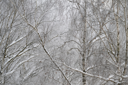 © beholdereye, Fototapeta premium Frosted bare branches forming minimalist silhouette against pale winter sky, subtle grain, calming monochrome composition, gentle snowfall, modern nature aesthetic
