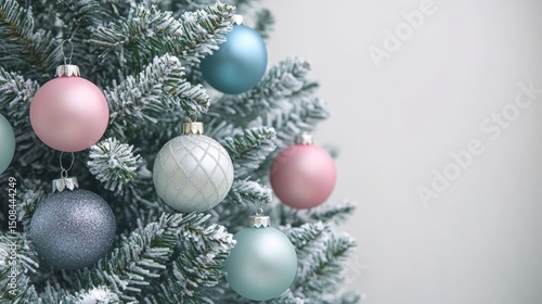 Fototapeta premium Frosted Christmas Tree Decorated with Silver, Blue, and Pink Baubles on White...