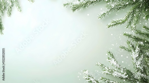 © Chantanapa, Obraz premium Frosted Evergreen Branches with Soft Snowfall on a Light Background