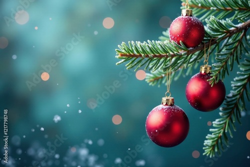 © box, Fototapeta premium Frosted pine branch with colorful Christmas ornaments, ornaments, decoration