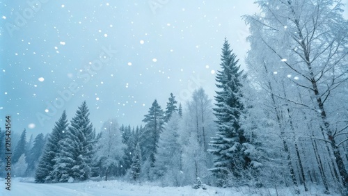 Naklejka premium Frosted trees stand against the pale blue sky as snowflakes gently fall in...