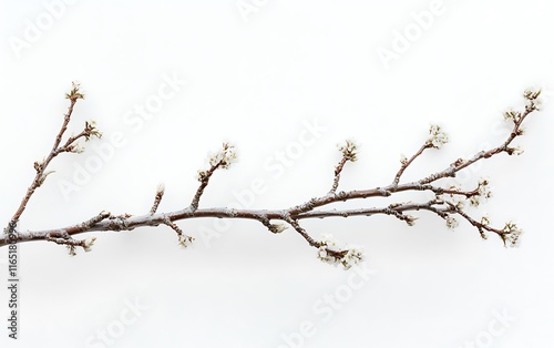 © ardanz, Obraz premium Frosty branch with tiny buds on white background.
