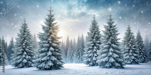 Fototapeta premium Frosty evergreen trees stand tall against a grey January sky, their branches etched in crystal white as snowflakes gently fall on the forest floor, january landscape, winter forest