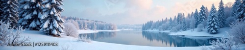 Naklejka premium Frosty forest landscape with snow-covered trees and frozen lake, icy, winter