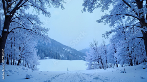 Fototapeta premium Frosty forest path leading to snowy mountains in winter