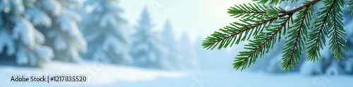 © Anulak, Obraz premium Frosty green fir branch on snowy white background, tree, nature, forest
