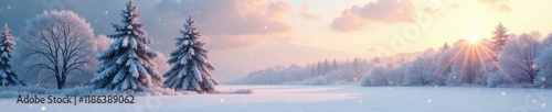 Fototapeta premium Frosty morning landscape with snow-covered trees and a few flakes falling gently from the sky, frosty morning, winter, snow