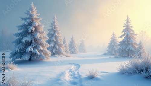 Fototapeta premium Frosty morning landscape with snow-covered trees and misty atmosphere, winter, soft
