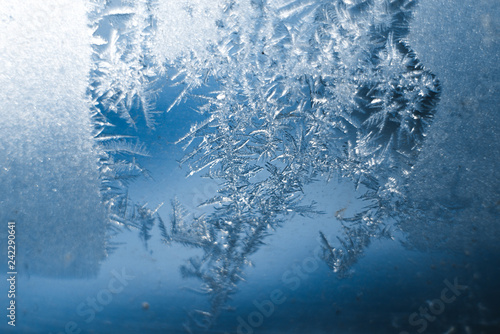 Fototapeta premium Frosty patterns on the frozen window are macro. Winter background
