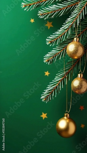Naklejka premium Frosty pine branches with golden ornaments against a green Christmas background, holiday, decoration
