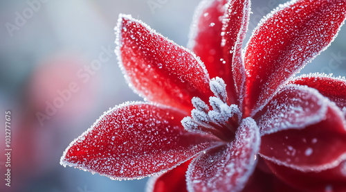 © oceanrider, Fototapeta premium Frosty red flower petals with snowy background in macro photography