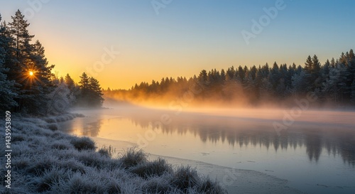 © Jersey, Fototapeta premium Frosty Sunrise Over a Misty River and Pine Forest