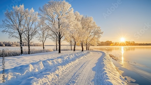 © M_H_L, Fototapeta premium Frosty Trees Line A Winter River Path Sunrise