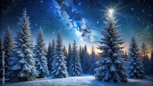 Fototapeta premium Frosty trees stand tall under starry night sky with branches glowing softly in the darkness, woodland scene, evergreen trees