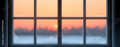 © Teerapat, Fototapeta premium Frosty Window with Sunrise View