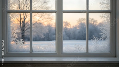 © MIkrom, Naklejka premium Frosty Windowpane With Winter Landscape at Sunrise Warm Light Through Trees
