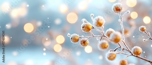 © Ai DreamscapesTH, Fototapeta premium Frosty Winter Berries on Branch with Sparkling Bokeh Lights Background