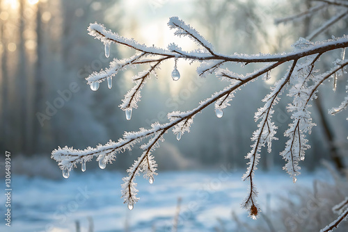 © Ahad, Obraz premium "Frosty Winter Branch with Icicles in Snowy Forest at Sunrise
