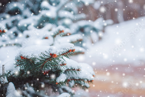 Naklejka premium Frosty winter landscape in snowy forest. Pine branches covered with snow in cold winter weather. Christmas background with fir trees and blurred background of winter.