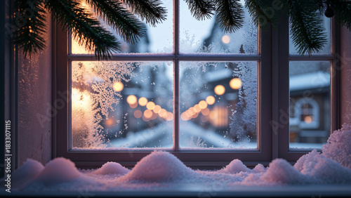 © Designbrisa, Fototapeta premium Frosty Winter Window with Snow and Warm Lights Outdoors