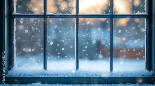© Asih, Naklejka premium Frosty winter window with snowflakes falling outside.