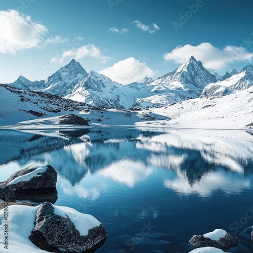 © Mhammad, Fototapeta premium Frozen alpine lake reflecting snow-capped peaks