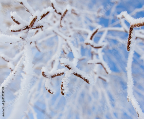 © schankz, Obraz premium Frozen branches on a tree against a blue sky