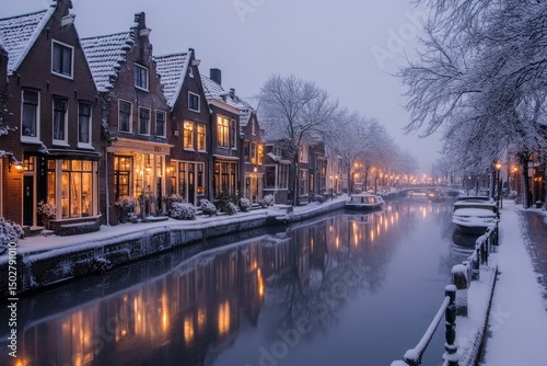 Fototapeta premium Frozen canal lined with quaint houses and softly glowing streetlights,...