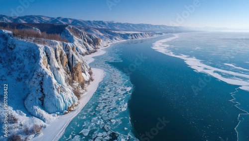 Obraz premium Frozen coastline, dramatic cliffs meet icy water