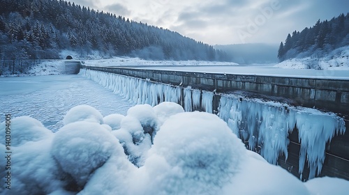 Obraz premium Frozen Dam with Icicles and Snow-covered Landscape