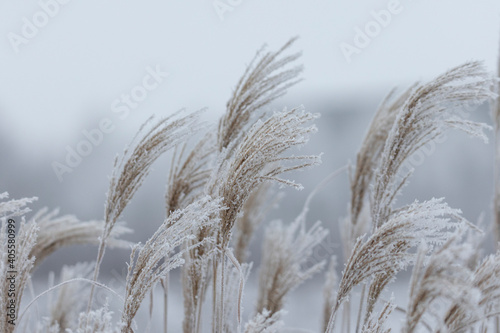 © were, Fototapeta premium Frozen ears of grass covered with hoarfrost in winter against blurred background