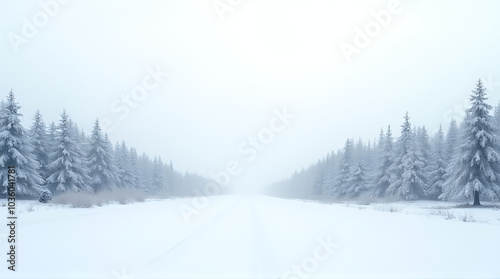 © Galeno, Naklejka premium frozen evergreen trees line winter landscape plenty empty white space text