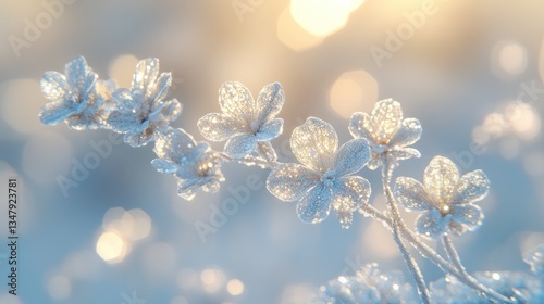 © andi, Fototapeta premium Frozen flower branch in winter sunrise