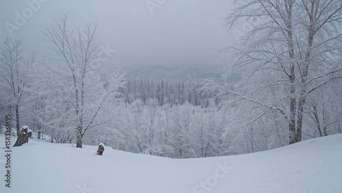 Fototapeta premium Frozen forest landscape featuring snow-laden trees and limbs