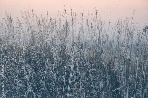 © Olga Burmistrova, Fototapeta premium frozen grass in snow with abstract background