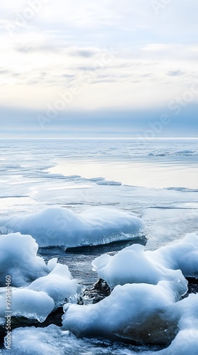 © Felippe Lopes, Obraz premium Frozen ice floes drift on a calm, blue lake.