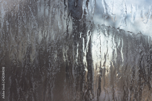© Evgeniy, Fototapeta premium Frozen ice on glass window. Gray background
