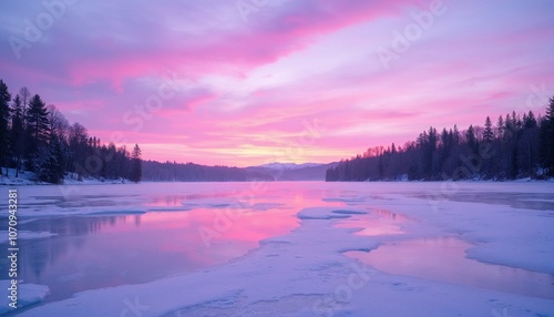 Fototapeta premium Frozen lake at dawn, calm and ethereal in soft pinks and purples