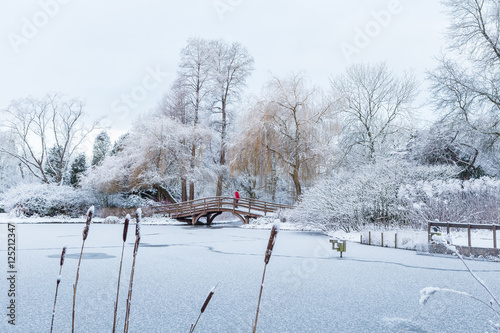 © Sander, Naklejka premium Frozen lake covered with snow. White winter landscape with reed, bridge and trees.