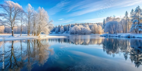 Fototapeta premium Frozen lake in winter forest with bare trees and snow-covered landscape,...