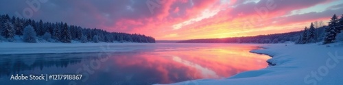 Fototapeta premium Frozen lake landscape at sunset with ice crystals in the air, calm, sky, ice...
