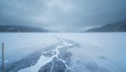 © bastet, Fototapeta premium Frozen lake with crack under overcast winter sky
