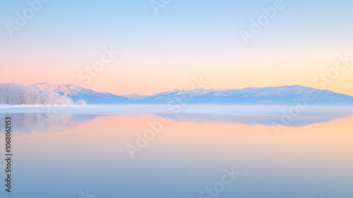 © ppearlgrey, Fototapeta premium frozen lake with crystal clear ice reflecting pastel sky at dawn