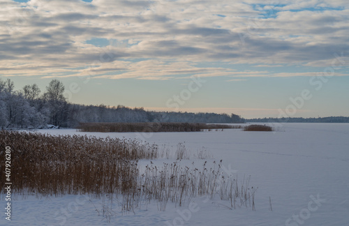 © Roman, Fototapeta premium Frozen lake with reeds. A bright winter evening.