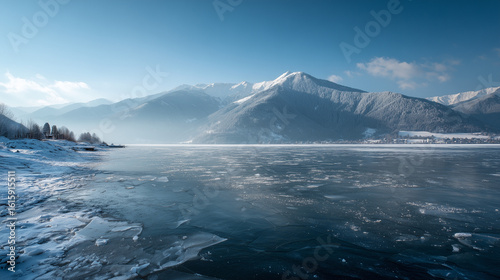 Naklejka premium Frozen lake with snowy mountains in background