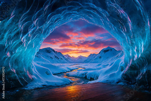 Naklejka premium Frozen Majesty: Ice Cave Opening to a Snowy Valley and a Vibrant Winter Sunset